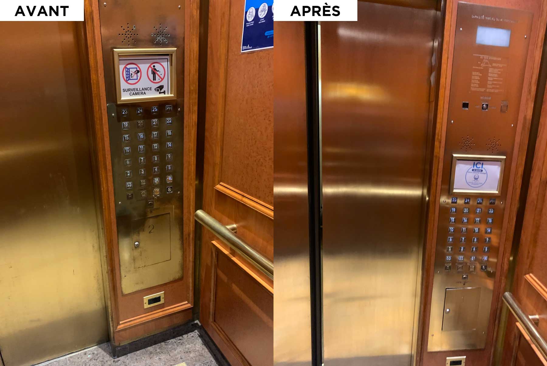 intérieur de cabine d’ascenseur endommagé puis remis à neuf
